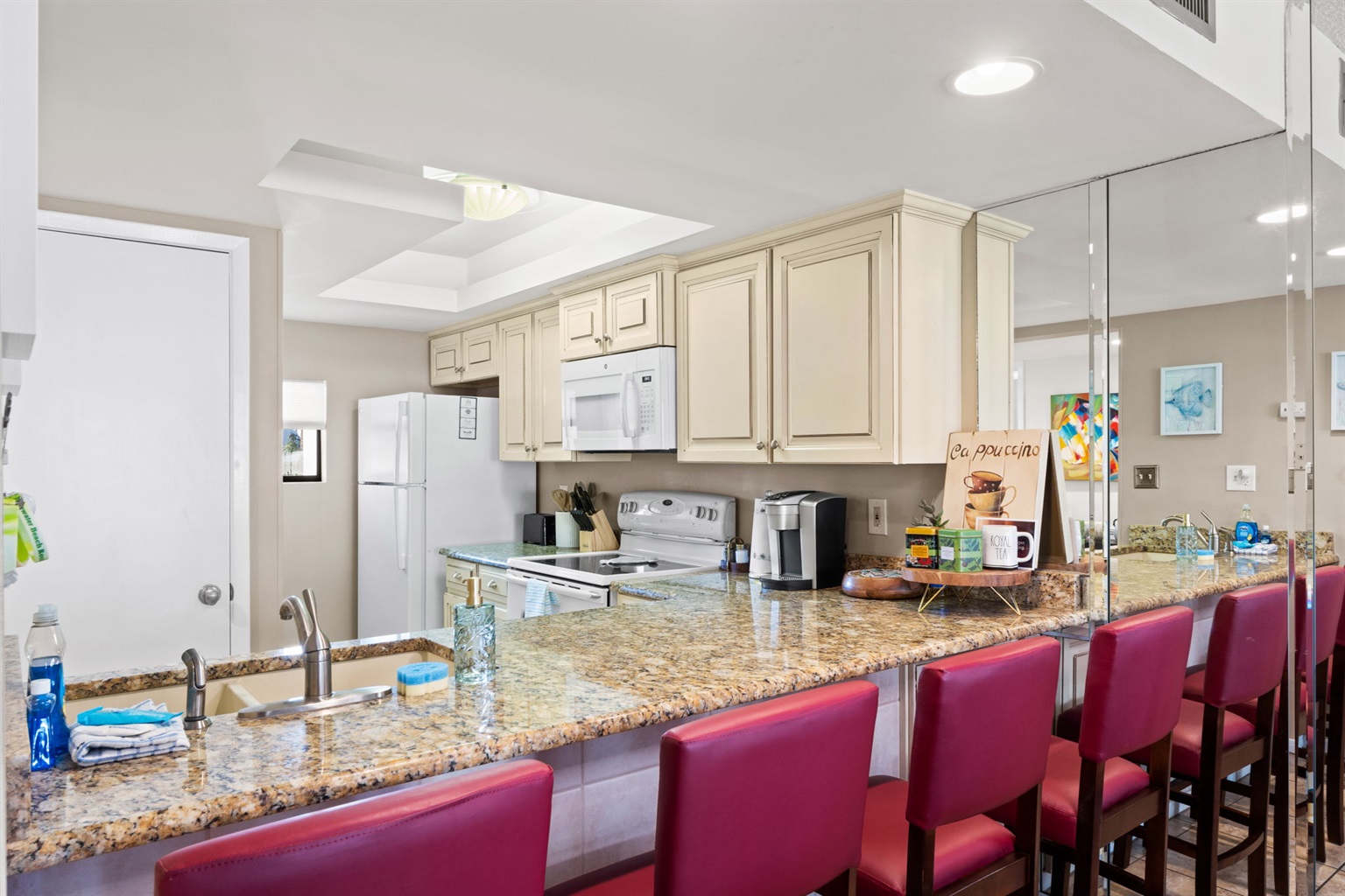 When it’s time to dine, Oceans Bar & Grill, the resort’s onsite beachfront restaurant, offers delicious meals with stunning views, while the nearby Tiki Bar is ideal for enjoying tropical drinks. Plus, multiple restaurants, shops, and entertainment options are within walking distance, making it easy to explore without ever getting in your car.